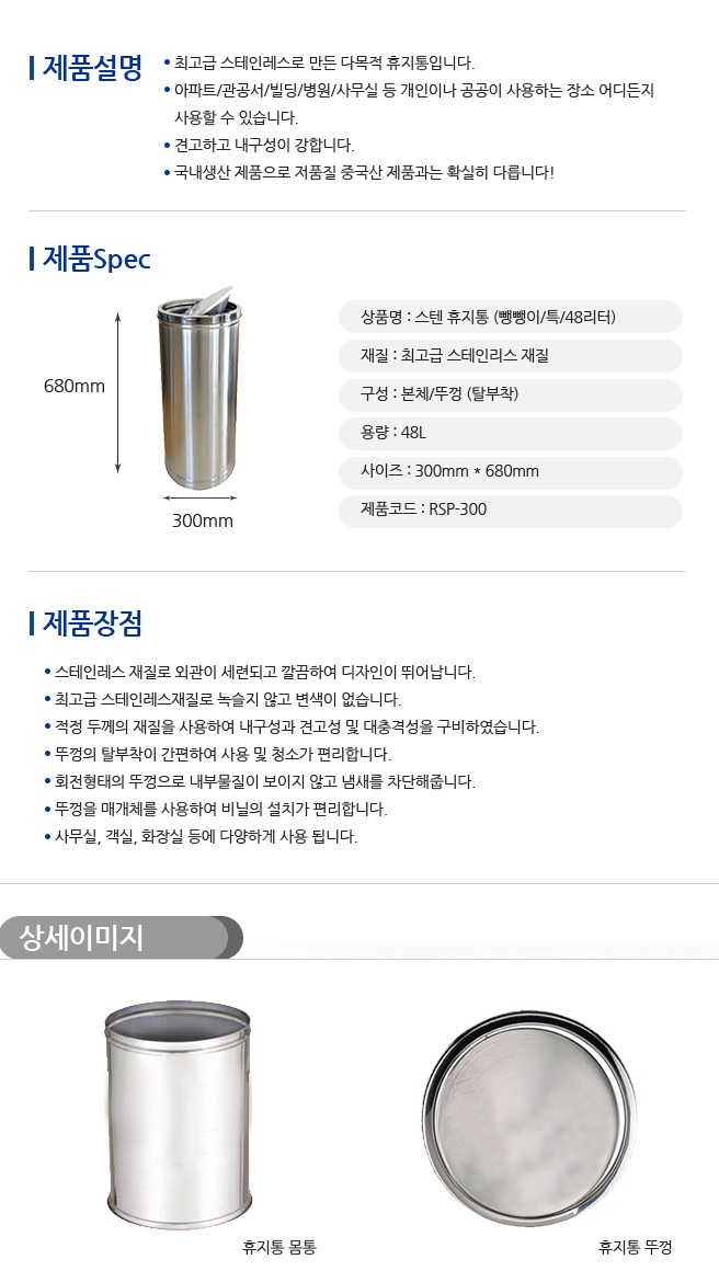 ■ 품명 및 모델명 : [업체배송]뱅뱅이 휴지통 스텐 실내용 AR400 50L 300x680mm