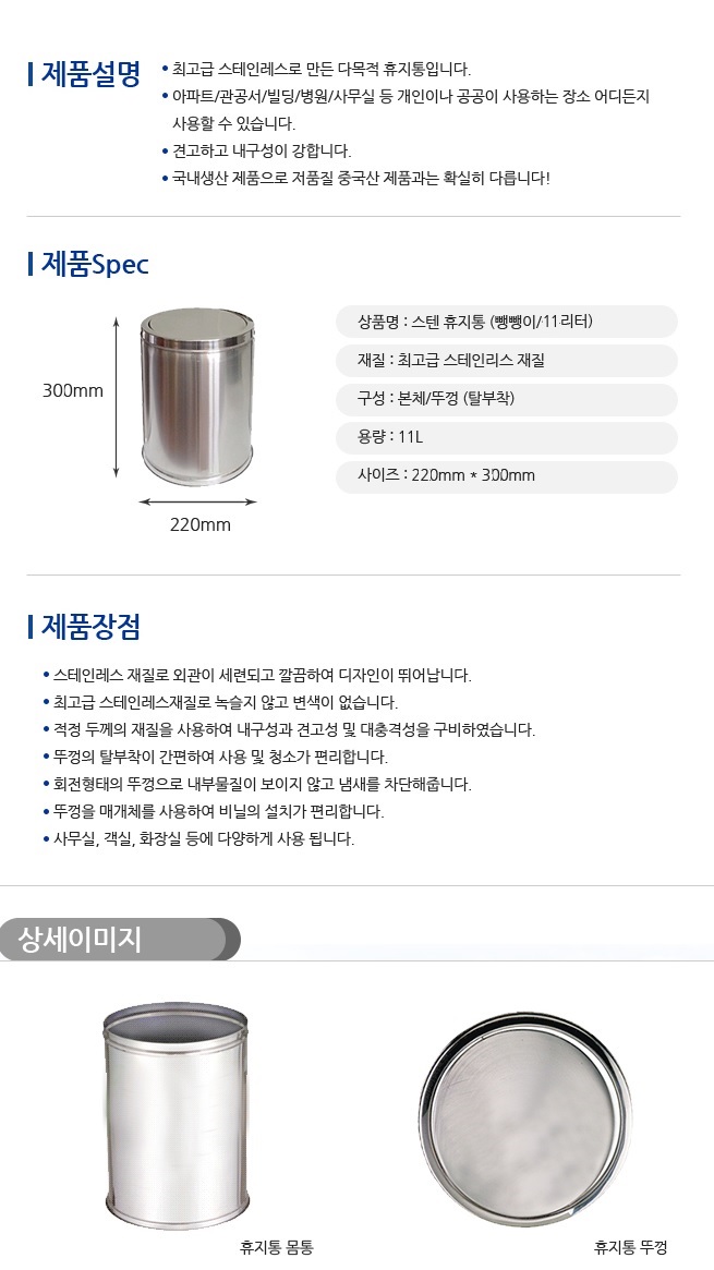 ■ 품명 및 모델명 : [업체배송]뱅뱅이 휴지통 스텐 사무실용 R600 11L 220x300mm