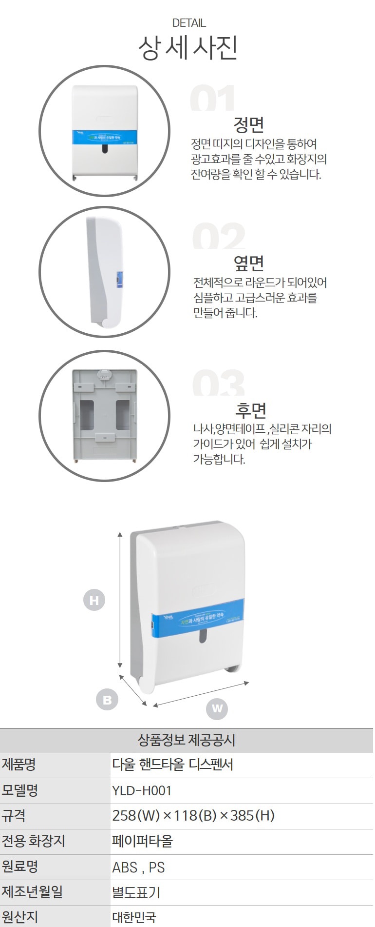 ■ 품명 및 모델명 : [업체배송]핸드타올 디스펜서 YLD-H001(K키형/260x385x120mm/유일실업)